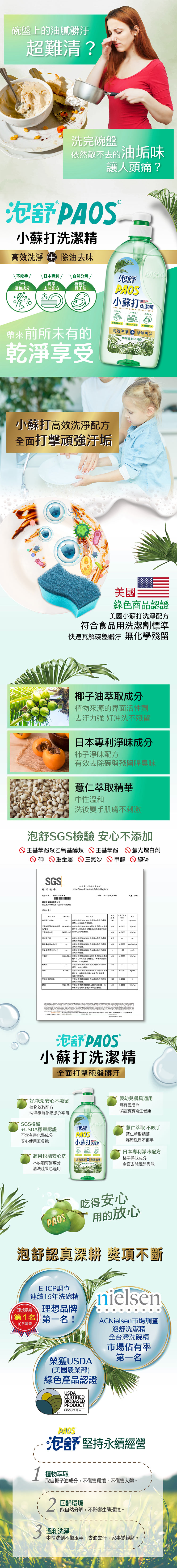 | 產品特色 | 泡舒小蘇打洗潔精 高效清潔 全面瓦解汙垢 ◆小蘇打高效洗淨配方 美國進口小蘇打成分,符合食器清潔規範,快速瓦解碗盤上的油膩髒汙 ◆植物性中性比例 椰子油萃取中性配方,低泡好沖洗,不擔心殘留 ◆日本專利淨味成分 添加日本專利柿單寧淨味因子,有效去除食物腥味與油脂臭味 ◆溫和親膚成分 薏仁萃取精華,洗後雙手肌膚不刺激 ◆不添加螢光劑、磷、壬基酚、三氯沙等有害化學物質,符合CNS3800國家標準食品用清潔劑標準 ◆生物分解度高於95%及低汙染 |
