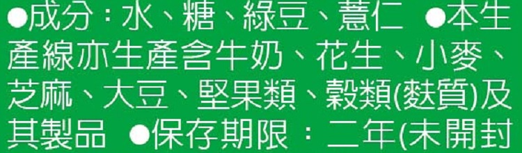 | 內容物(成分) | 水、糖、綠豆、薏仁 |