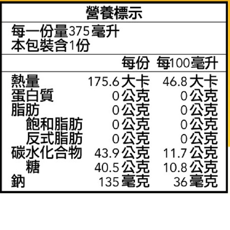 | 內容物(成分) | 水、蔗糖、芭樂原汁、芒果原汁、柳橙濃縮汁、蘋果濃縮汁、羧甲基纖維素鈉、蘋果酸 |