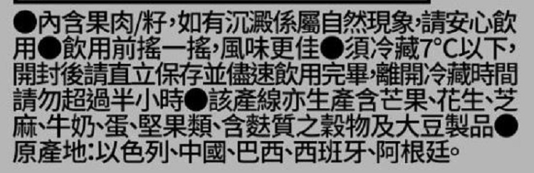 | 過敏源註記 | 該產線亦生產含芒果、花生、芝麻、牛奶、蛋、堅果類、含麩質之穀物及大豆製品。 |
