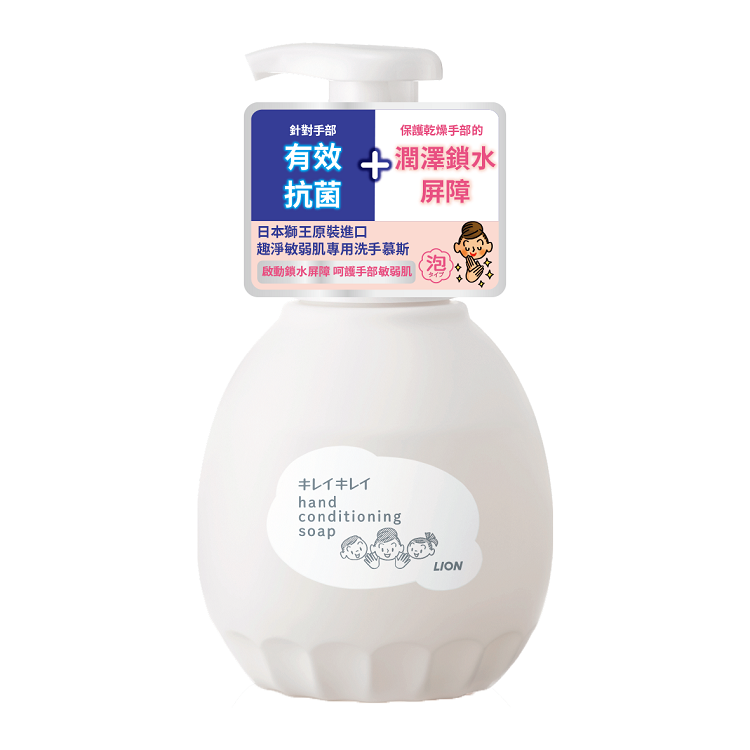 | 其他詳細說明 | "啟動潤澤鎖水屏障、呵護手部敏弱肌 ・日本研發「潤澤鎖水屏障」配方,鎖住肌膚水分、預防肌膚越洗越乾燥 ・添加IPMP抗菌成份,有效對抗髒污細菌 ・清潔洗淨成分再增加1.6倍* *與「趣淨抗菌洗手慕斯250ml」相比 ・採用日本SIAA認證的抗菌壓頭,可長時間保持抗菌狀態 ・好感瓶身設計,融入各種裝潢風格的乳白色、搭配觸感溫柔的圓弧狀,另人愛不釋手 ・溫和皂香,清新不刺激的柔和清香" |