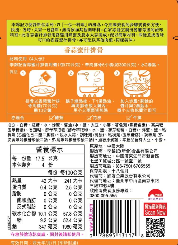 | 產品特色 | 李錦記方便醬料包系列,以"一包一料理"的概念,令烹調美食的步驟變得更方便,快捷,省時。只需一包醬料,無需添加其他調味料,在家亦能烹調出餐廳等級的滋味料理。 此香蒜蜜汁排骨用醬 選用蜂蜜及脫水大蒜製成,配以簡單材料,即能煮成香味可口的香蒜蜜汁排骨,亦可配以其他肉類, |
