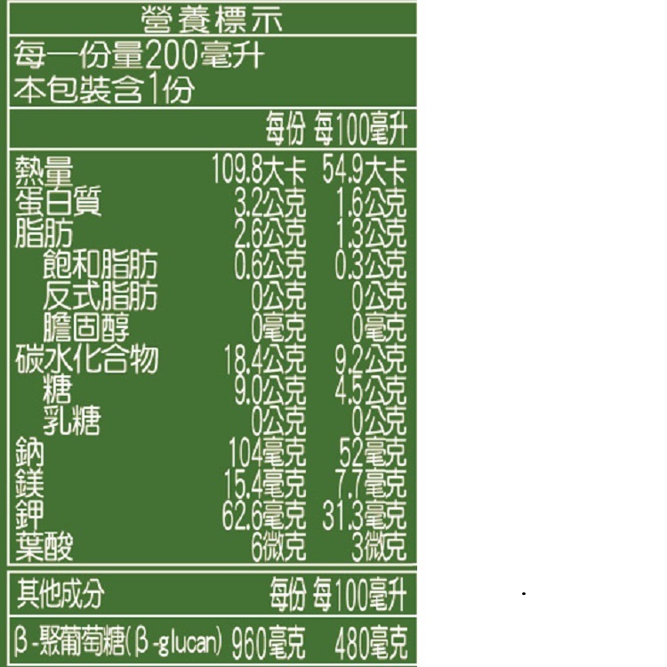 | 產品特色 | 1. 標竿歐美燕麥奶,台灣第一支直接喝也好喝的歐美風味燕麥奶 2. 牛奶般的滑順口感,香醇不黏膩 3. β-聚葡萄糖(β-glucan)960mg/瓶 4. 原料單純:水、燕麥粉,無添加糖、膠體 5. 獨特水解工法,保留燕麥自然香氣和甜感 6. 搭配咖啡、果乾穀片、製作燕麥粥都相當合適 7. 0膽固醇,無添加香料、無添加色素、無添加防腐劑 8. 不含乳糖,素食可食用 |