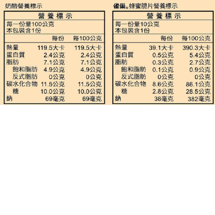 | 內容物(成分) | 奶酪原料: 水、鮮奶油、奶粉、蔗糖、奶油、玉米澱粉、鹿角菜膠、脂肪酸甘油脂、刺槐豆膠、玉米糖膠、食鹽、碳酸鈣 脆片: 蜂蜜脆片(非基因改造玉米粉、非基因改造全榖玉米、蔗糖、蜂蜜、碳酸鈣、大麥麥芽萃取物(大麥麥芽、樹薯澱粉)、葡萄糖漿、加碘食鹽(食鹽、碘酸鉀)、非氫化棕櫚油、磷酸鈉(無水)、脂肪酸甘油脂、抗氧化劑(混合濃酸生育醇)、菸鹼醯胺、還原鐵、本多酸鈣、維生素B6、維生素B2、葉酸) |