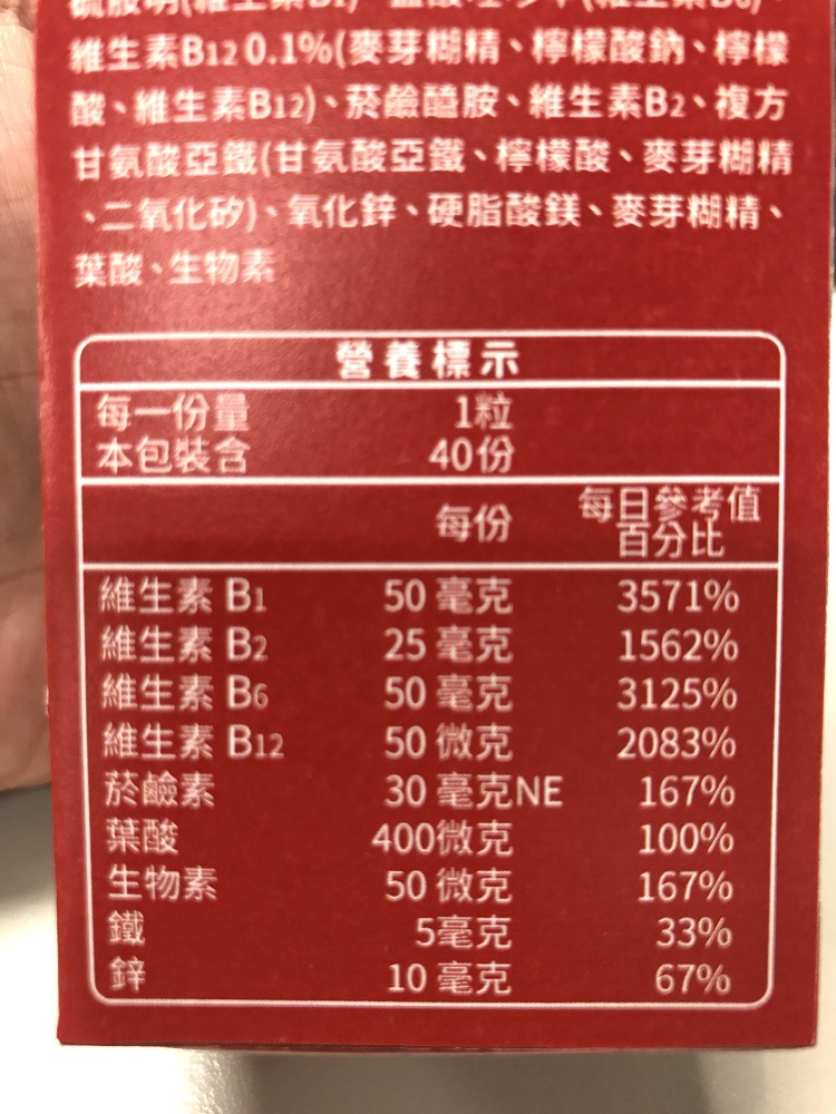 | 內容物(成分) | 膠囊(明膠、純水、二氧化鈦、食用黃色5號、食用紅色6號、食用黃色4號)、鹽酸硫胺明(維生素B1)、鹽酸呸哆辛(維生素B6)、維生素B12 0.1%(麥芽糊精、檸檬酸鈉、檸檬酸、維生素B12)、菸鹼醯胺、維生素B2、複方甘氨酸亞鐵(甘氨酸亞鐵、檸檬酸、麥芽糊精、二氧化矽)、氧化鋅、硬脂酸鎂、麥芽糊精、葉酸、生物素 |