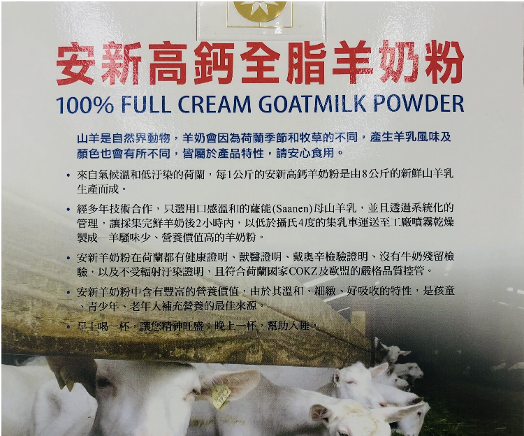 | 產品特色 | *來自氣候溫和低汙染的荷蘭,每1公斤的安新高鈣羊奶粉是由8公斤的新鮮山羊乳生產而成。 *100%純正羊奶粉,低腥味,無添加任何香料、防腐劑、更無攙雜牛奶粉。 *高鈣質,幫助牙醫及骨骼正常發育。 *含有豐富的營養價值,由於其溫和、細緻、好吸收的特性,是孩童、青少年、老年人補充營養的最佳來源。 *製作營養補充飲品、饅頭、羊乳片、高鈣餅乾…等應用。 |