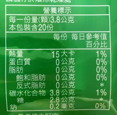| 食品添加物名稱 | 天然食用色素紅花黃、I-薄荷腦、香草香料、桉葉油精、香料、食用藍色一號。 |