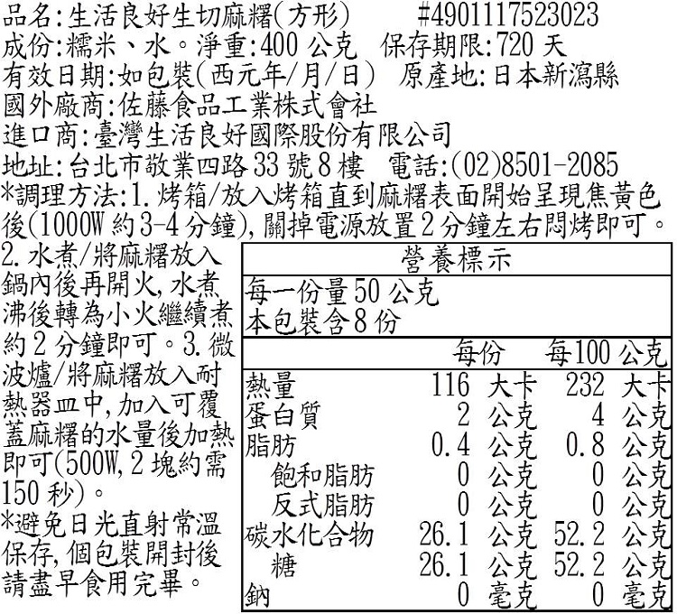 | 製造廠商 | 佐藤食品工業株式會社 025-876 新瀉市東区寶町13番5號 週一到周五 早上9點-晚上6點 |