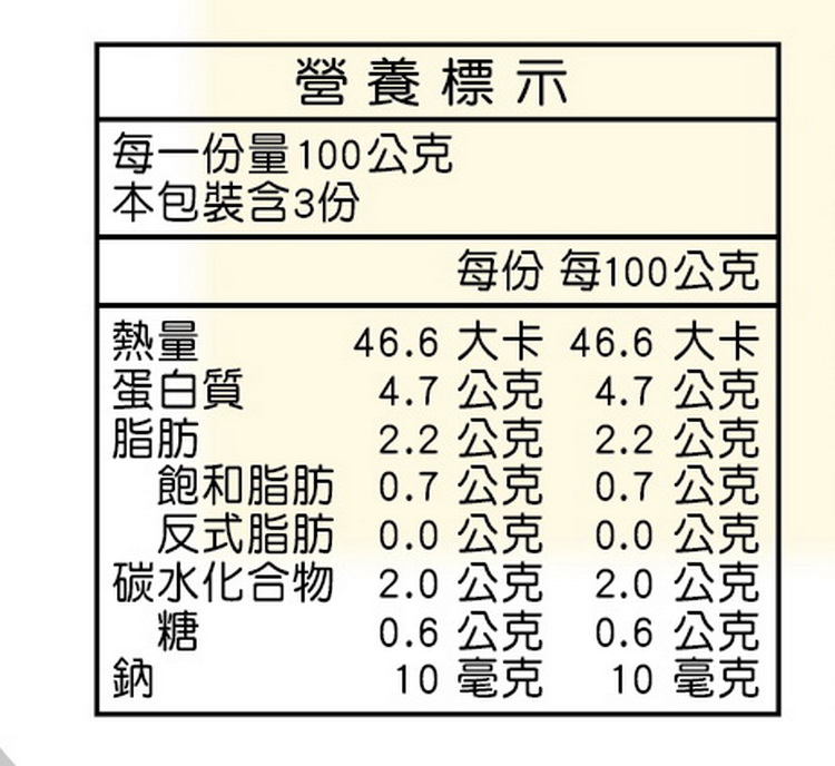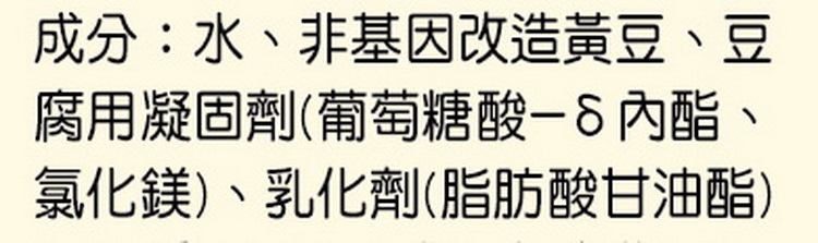 | 內容物(成分) | 水.非基因改造黃豆.豆腐用凝固劑(葡萄酸-ò內脂.氯化鎂)乳化劑(脂肪酸甘油脂) |