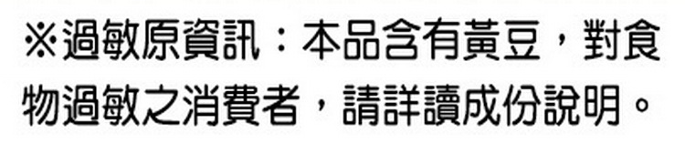 | 過敏源註記 | 本產品含有黃豆對食物過敏之消費者請詳讀成分 |