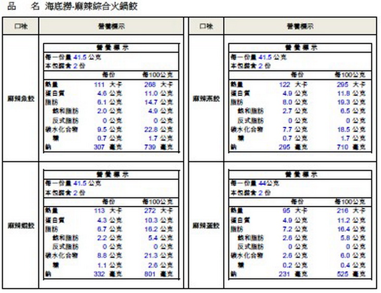 | 內容物(成分) | 蛋餃:豬肉(加拿大)、魚漿(魚肉、蔗糖、多磷酸鈉、蛋白粉)、雞肉、樹薯澱粉、馬鈴薯澱粉、水、粘著劑(磷酸二澱粉、磷酸澱粉)、調味油[大豆油、辣椒、花椒、豆瓣醬(辣椒、蠶豆、食鹽、麵粉)、薑、蔥、蒜、香辛料(小茴香、白芷、砂仁、八角、桂皮、山奈、甘草、陳皮)、蔗糖、白酒、豆豉(大豆、水、食鹽)、香料、酵母調味料(酵母、水、L-麩酸鈉、檸檬酸鈉)、胡椒、5'-鳥嘌呤核苷磷酸二鈉、5'-次黃嘌呤核苷磷酸二鈉]、蔗糖、魷魚、L-麩酸鈉、食鹽、香油(芝麻油、大豆油)、小麥蛋白、大豆蛋白、棕櫚油、雞心辣椒粉、辣椒粉、白胡椒粉、抗氧化劑(異抗壞血酸鈉)、花椒粉、多磷酸鈉、魚抽出物、蒜粉、保色劑(亞硝酸鈉)。 蝦餃: 豬肉(加拿大)、水、魚漿(魚肉、蔗糖、多磷酸鈉、蛋白粉)、雞肉、樹薯澱粉、馬鈴薯澱粉、粘稠劑(磷酸二澱粉、磷酸澱粉)、蔗糖、調味油[大豆油、辣椒、花椒、豆瓣醬(辣椒、蠶豆、食鹽、麵粉)、薑、蔥、蒜、香辛料(小茴香、白芷、砂仁、八角、桂皮、山奈、甘草、陳皮)、蔗糖、白酒、豆豉(大豆、水、食鹽)、香料、酵母調味料(酵母、水、L-麩酸鈉、檸檬酸鈉)、胡椒、5'-鳥嘌呤核苷磷酸二鈉、5'-次黃嘌呤核苷磷酸二鈉]、L-麩酸鈉、食鹽、香油(芝麻油、大豆油)、蝦仁、蝦萃取物、小麥蛋白、麵粉、大豆蛋白、棕櫚油、雞心辣椒粉、蒟蒻粉、辣椒粉、白胡椒粉、花椒粉、多磷酸鈉、芹菜粉、抗氧化劑(異抗壞血酸鈉)、香料、保色劑(亞硝酸鈉)、紅麴色素、蒜頭、氧化鈣。 燕餃: 豬肉(加拿大)、魚漿(魚肉、蔗糖、多磷酸鈉、蛋白粉)、雞肉、水、樹薯澱粉、馬鈴薯澱粉、粘著劑(磷酸二澱粉、磷酸澱粉)、調味油[大豆油、辣椒、花椒、豆瓣醬(辣椒、蠶豆、食鹽、麵粉)、薑、蔥、蒜、香辛料(小茴香、白芷、砂仁、八角、桂皮、山奈、甘草、陳皮)、蔗糖、白酒、豆豉(大豆、水、食鹽)、香料、酵母調味料(酵母、水、L-麩酸鈉、檸檬酸鈉)、胡椒、5'-鳥嘌呤核苷磷酸二鈉、5'-次黃嘌呤核苷磷酸二鈉]、大豆蛋白、蔗糖、香油(芝麻油、大豆油)、食鹽、白胡椒粉、小麥蛋白、L-麩酸鈉、雞心辣椒粉、棕櫚油、辣椒粉、蛋白粉、花椒粉、多磷酸鈉、抗氧化劑(異抗壞血酸鈉)、香料、蒜粉、五香粉(肉桂、小茴香、胡荽、丁香、八角)、保色劑(亞硝酸鈉)、甜味劑(甘草萃)。 蛋餃: 雞蛋、豬肉(加拿大)、水、醋酸澱粉、雞肉、大豆蛋白、樹薯澱粉、調味油[大豆油、辣椒、花椒、豆瓣醬(辣椒、蠶豆、食鹽、麵粉)、薑、蔥、蒜、香辛料(小茴香、白芷、砂仁、八角、桂皮、山奈、甘草、陳皮)、蔗糖、白酒、豆豉(大豆、水、食鹽)、香料、酵母調味料(酵母、水、L-麩酸鈉、檸檬酸鈉)、胡椒、5'-鳥嘌呤核苷磷酸二鈉、5'-次黃嘌呤核苷磷酸二鈉]、L-麩酸鈉、食鹽、香油(芝麻油、大豆油)、蔗糖、雞心辣椒粉、辣椒粉、黑胡椒粉、花椒粉、抗氧化劑(異抗壞血酸鈉)、白胡椒粉、ß-胡蘿蔔素[阿拉伯膠、葵花油、麥芽糊精、蔗糖、水、β-胡蘿蔔素、抗氧化劑(L-抗壞血酸棕櫚酸酯、維生素E)]、豬脂(台灣)。 |