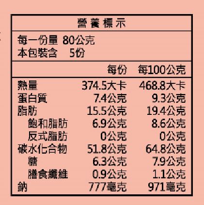 | 內容物(成分) | 成份: ﹝麵身﹞:小麥麵粉(67%)、精製棕櫚油含抗氧化劑(第三丁基氫醌)、食鹽、品質改良劑(多磷酸鈉、碳酸鉀、碳酸鈉)、關華豆膠。 ﹝調味粉包﹞:糖、食鹽、調味劑(L-麩酸鈉、5'-次黃嘌呤核苷磷酸二鈉、5'-鳥嘌呤核苷磷酸二鈉)、大蒜、雞肉香料、洋蔥、普通焦糖、食用二氧化矽。 ﹝調味油包﹞:精製棕櫚油含抗氧化劑(第三丁基氫醌)、紅蔥頭、洋蔥香料。 ﹝辛香甜醬油包﹞:糖、水、食鹽、小麥、黃豆、香辛料(檸檬草、大茴香)、芝麻油。 ﹝辣椒粉包﹞:辣椒粉。 |