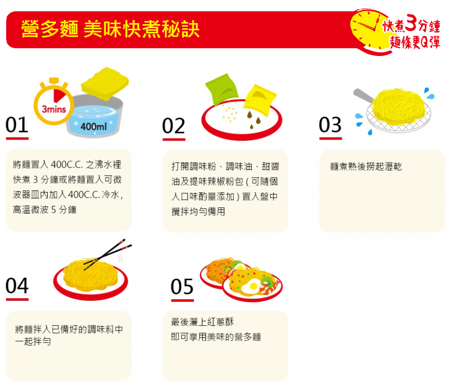 | 產品特色 | ★全球消費者最常選購的速食麵品牌 ★網友們封營多麵為「泡麵界王者」 ★美國泡麵之神Hans Lienesch狂推超越五星級的美味 ★全球銷售達170億包,平均每秒可賣出539包超狂紀錄 ★「營多珍饌系列」天然香料加天然辣椒研發出漸層口感 ★獨立醬包隨意添加,加1/2辣椒粉台灣人最愛 ★快煮3分鐘,”煮”的比”泡”的麵條更Q彈 ★印尼極品炒麵 給您漸層式的味蕾饗宴 |