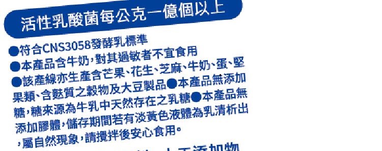 | 內容物(成分) | 100%生乳、活性乳酸菌(嗜酸乳桿菌Lactobacillus acidophilus、比菲德氏菌Bifidobacterium lactis、嗜熱鏈球菌Streptococcus thermophilus、德氏乳桿菌乳酸亞種Lactobacillus delbrueckii subsp. lactis、保加利亞乳桿菌Lactobacillus delbrueckii subsp. bulgaricus) |