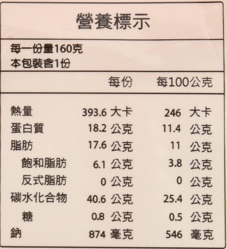 | 內容物(成分) | 豬絞肉、芝麻油、水、鹽、蛋、米酒、蒜、薑、糖、L-麩酸鈉、胺基乙酸、麥芽糊精、豬肉抽出物、L-天門冬酸鈉、維生素B1、 維生素C(抗氧化劑)、維生素E(抗氧化劑)、乳酸、肉桂、荳蔻、麵粉、黃豆粉、乙醯化磷酸二澱粉、D-山梨醇液70%(甜味劑)、 無水碳酸鈉、羧甲基纖維素、大豆卵磷脂 調味包:醬油、香油、水、鹽、豬肉抽出物、雞肉抽出物 |