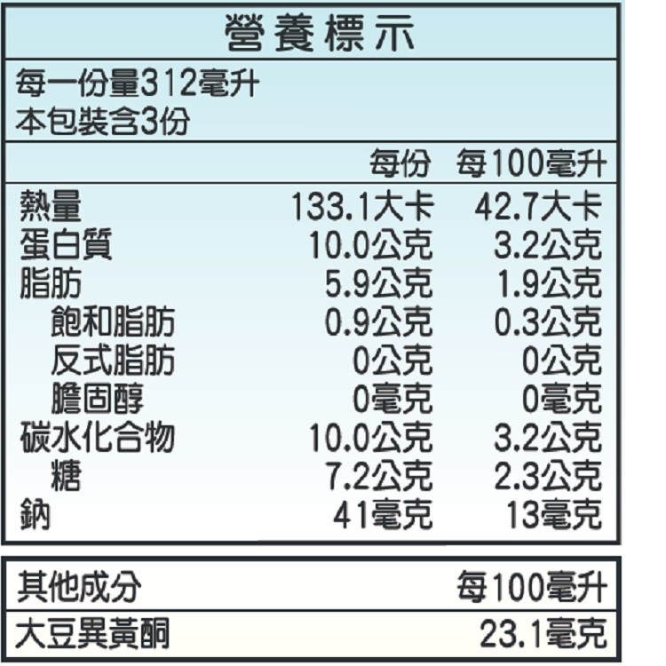 | 內容物(成分) | 水、非基因改造黃豆、蔗糖 |