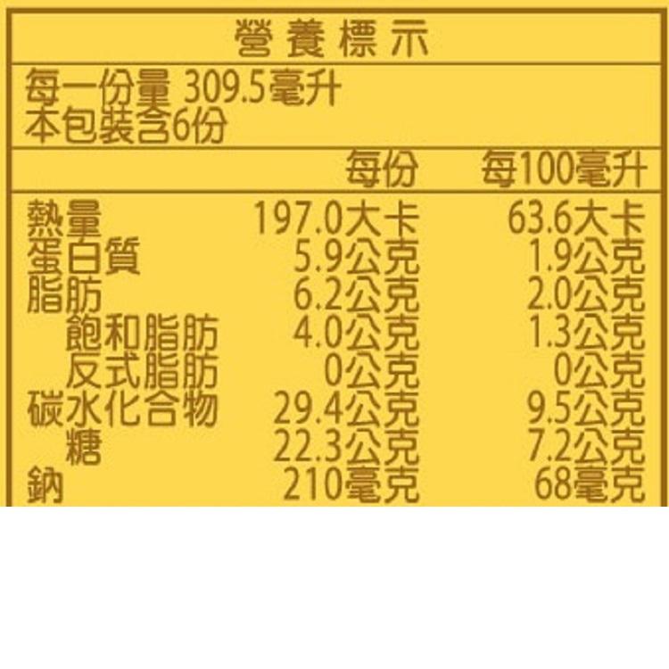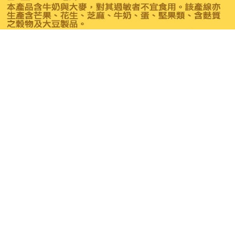 | 過敏源註記 | 本產品含牛奶及大麥,對其過敏者不宜食用 該產線亦生產含芒果、花生、芝麻、牛奶、蛋、堅果類、含麩質之穀物及大豆製品 |