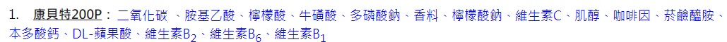 | 內容物(成分) | 碳酸水、蔗糖、胺基乙酸、檸檬酸、牛磺酸、多磷酸鈉、香料(香料、乙醇、水)、檸檬酸鈉、維生素C、肌醇、咖啡因(20mg/100mL以下)、菸鹼醯胺、本多酸鈣、DL-蘋果酸、維生素B2、維生素B6、維生素B1 |