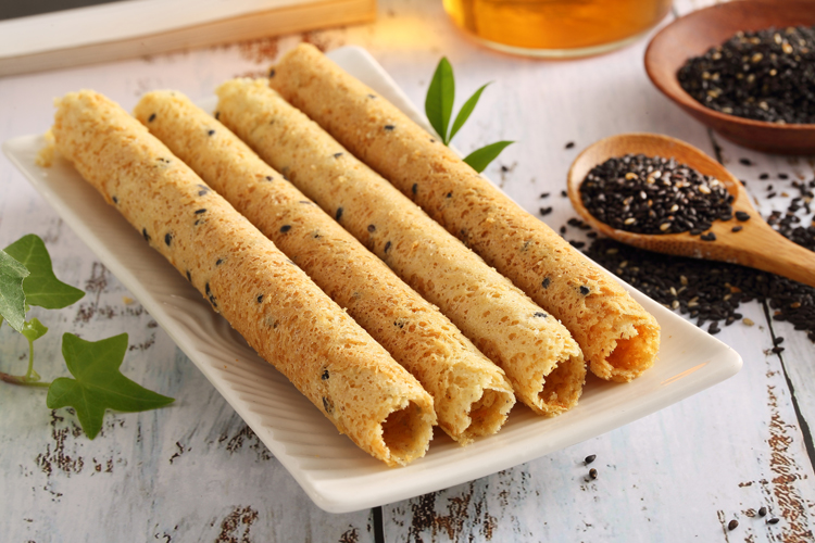 | 產品特色 | 精選營養價值高的芝麻添加於原味蛋捲製成 製造過程堅持不加一滴水 以植物油製成,蛋素者也可安心品嚐 |