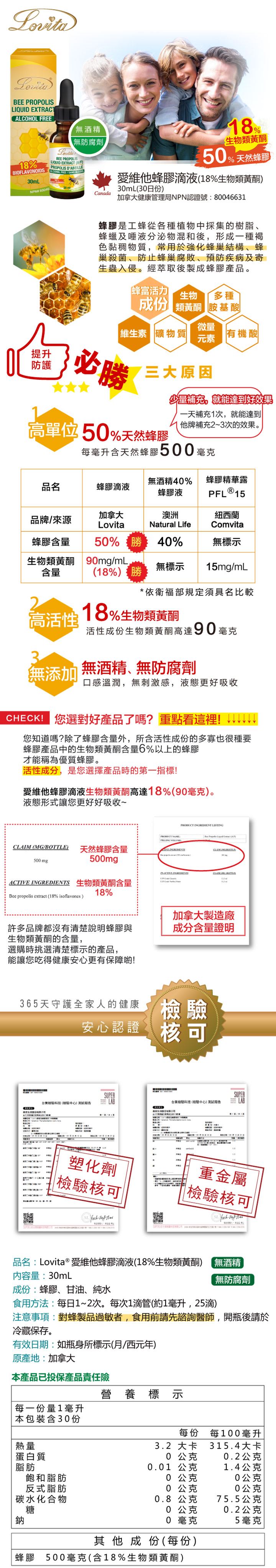 | 產品特色 | 增強防護力 ◎ 50%天然蜂膠(每毫升500毫克) ◎ 生物類黃酮高達18% ◎ 無酒精、無防腐劑 |