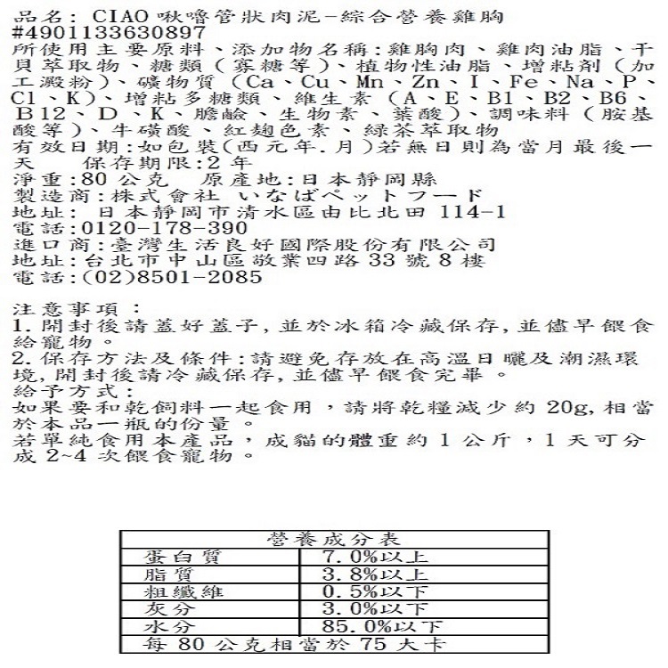| 製造廠商 | 株式會社 いなばペットフード 0120-178-390 日本靜岡市清水區由比北田114-1 週一到週五 早上9點-晚上6點 |