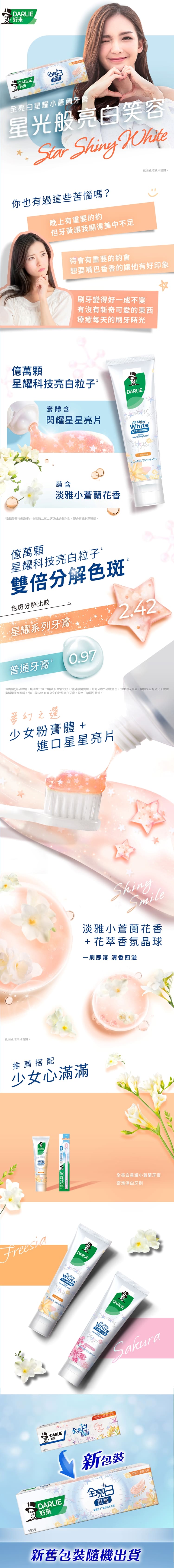 | 產品特色 | 億萬星耀科技亮白粒子配方幫助拋光去漬 抵禦色斑 進口星星片 少女粉膏體 公主心滿滿夢幻之選 淡雅小蒼蘭花香 花萃香氛晶球 一刷即溶 清香四溢 |