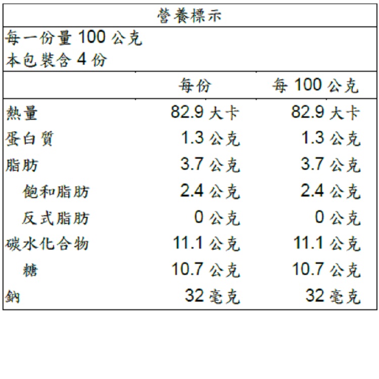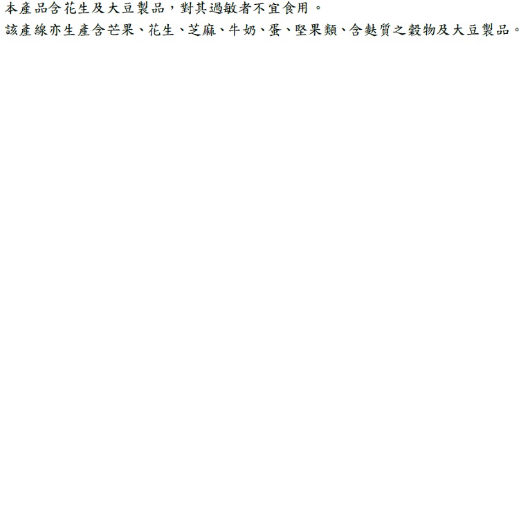 | 過敏源註記 | 本產品含牛奶及堅果類,對其過敏者不宜食用 該產線亦生產含芒果、花生、芝麻、牛奶、蛋、堅果類、含麩質之穀物及大豆製品 |