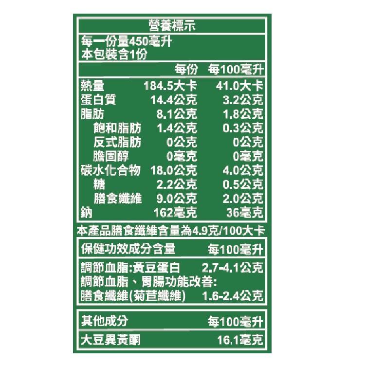 | 內容物(成分) | 水、非基因改造黃豆、菊苣纖維、燕麥粉、精鹽 |