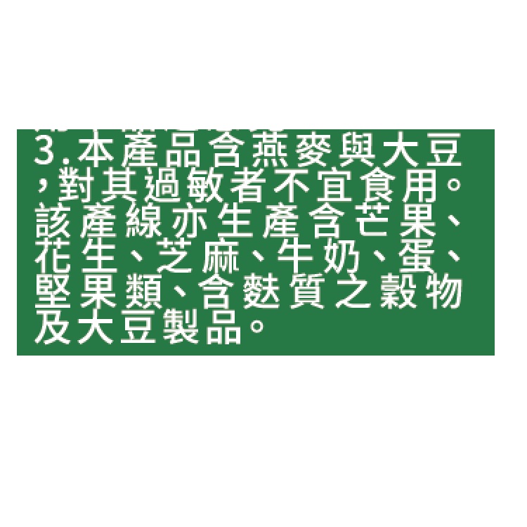 | 過敏源註記 | 本產品含燕麥與大豆,對其過敏者不宜食用,該產線亦生產含芒果、花生、芝麻、牛奶、蛋、堅果類、含麩質之穀物及大豆製品 |