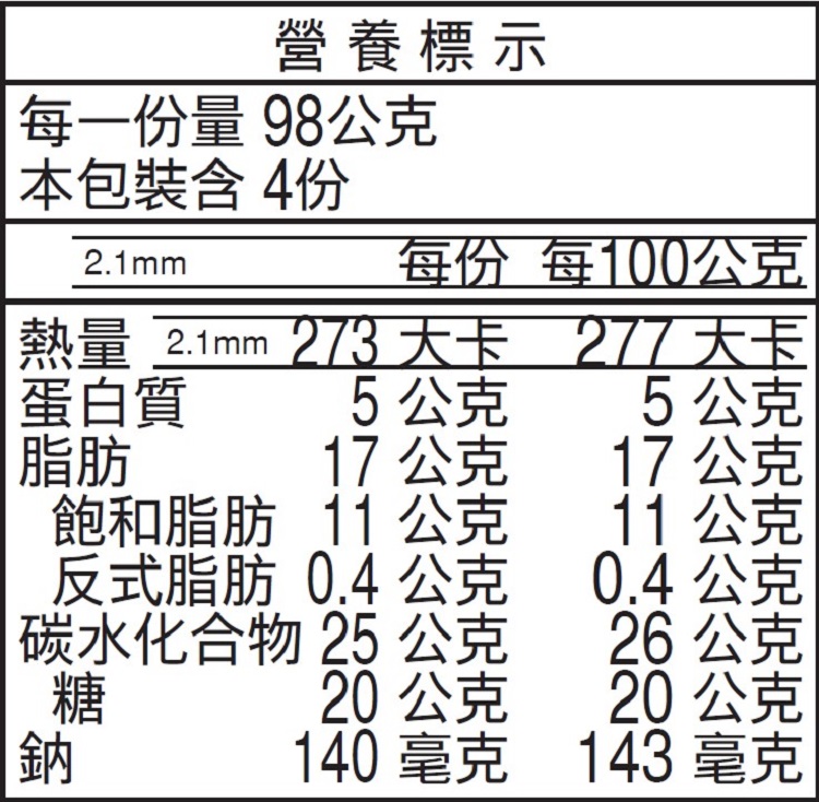 | 過敏源註記 | 本產品含有牛乳、麩質穀物、雞蛋、堅果類、種子類和大豆成分 |