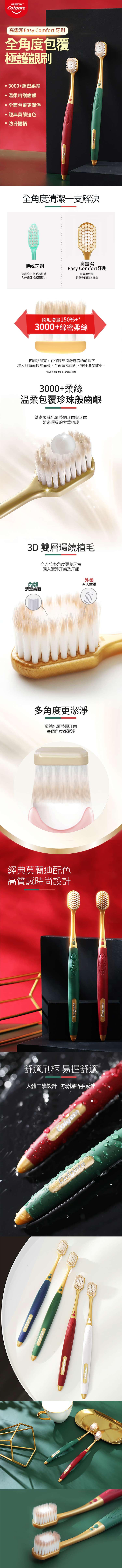 | 產品特色 | (1) 3000+柔絲刷毛,綿密包覆牙齒及牙齦,帶來頂級的奢華呵護。 (2) 環繞包覆整顆牙齒,幫助多角度潔淨。 (3) 高質感設計,搭配經典時尚配色,防滑握柄手感佳。 |