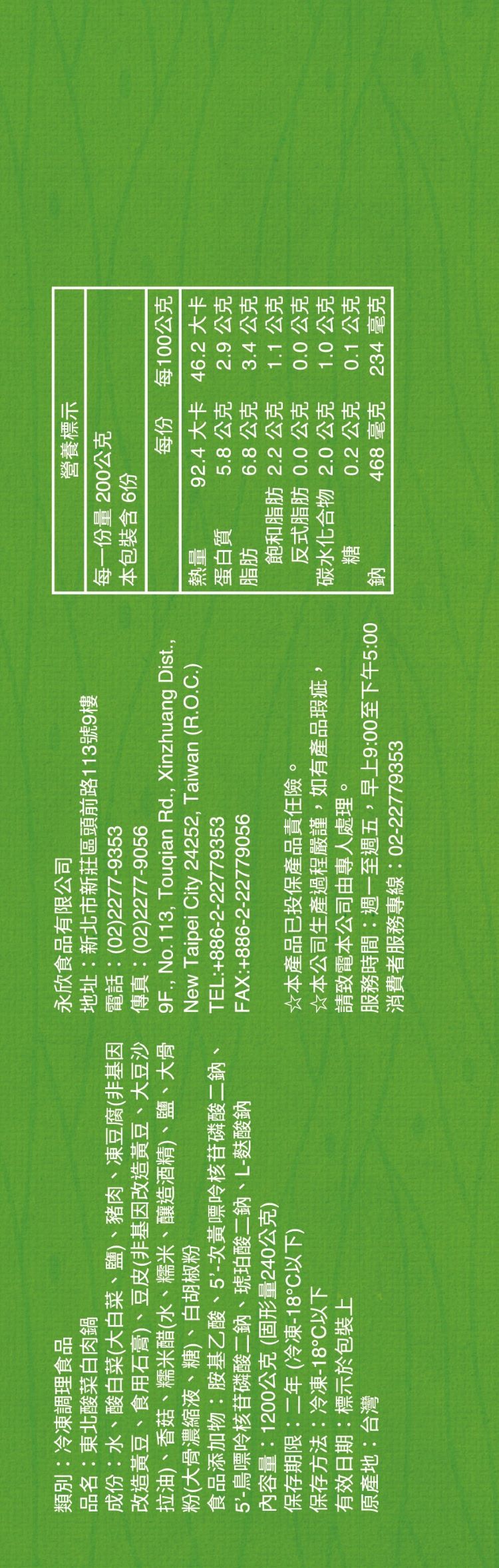 | 製造廠商 | 永欣食品有限公司 02-22779353 新北市新莊區頭前路113號9樓 AM9:00-PM5:00 |
