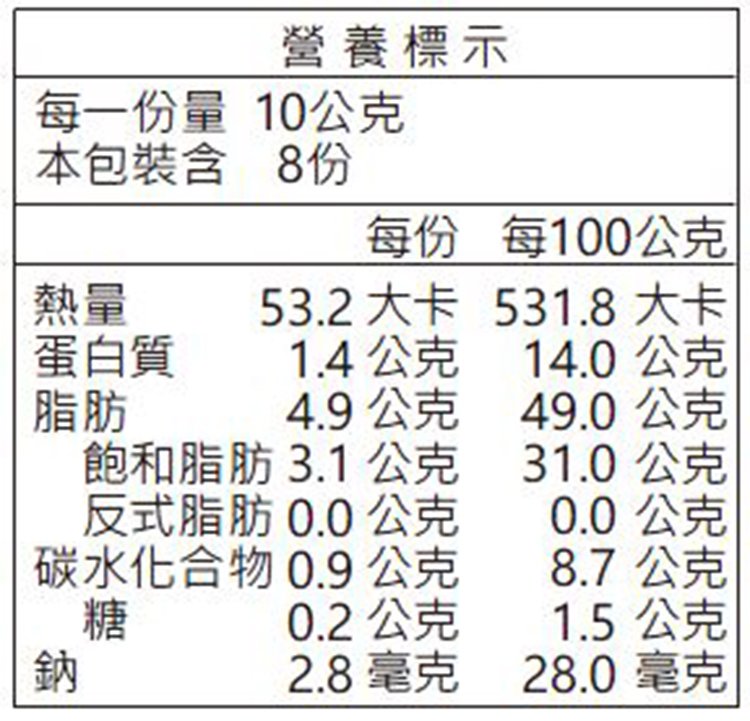 | 過敏源註記 | 本產品其生產製程廠房的設備或生產管線有處理堅果、牛奶和大豆類,對其有過敏體質者請斟酌食用 |
