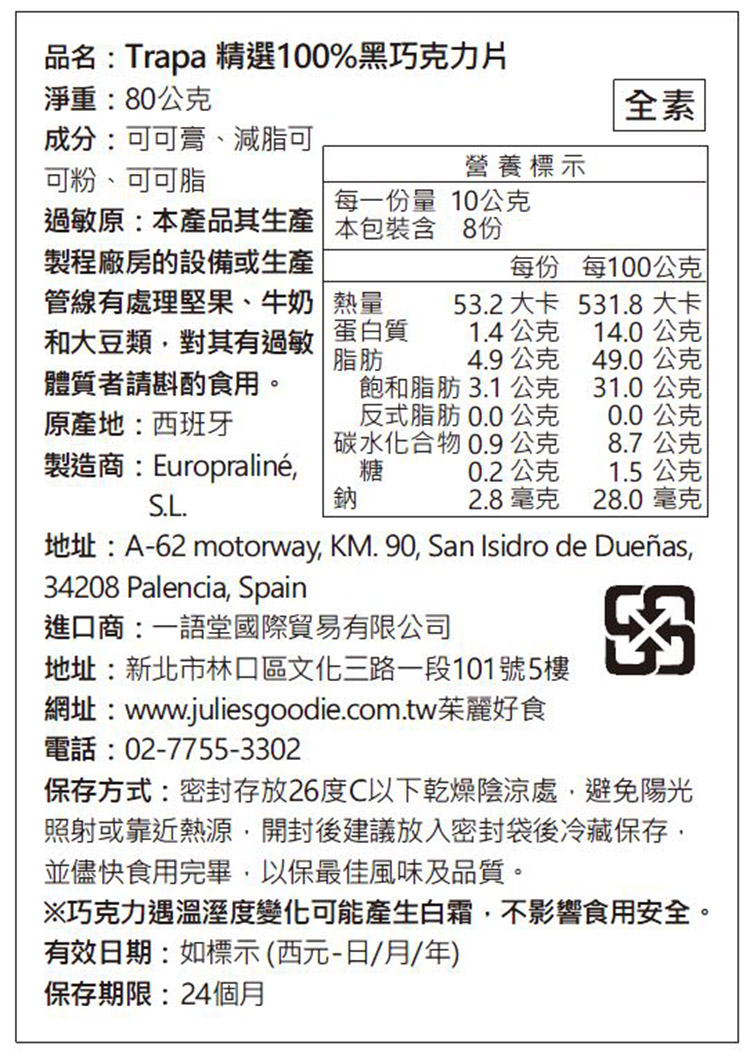 | 商品說明 | 1.西班牙百年巧克力工藝,精選優質可可豆與天然原料,價格親民 2.高純度黑巧克力,細膩滑順不苦澀 3.無麩質、無色素、無防腐劑、全素 |