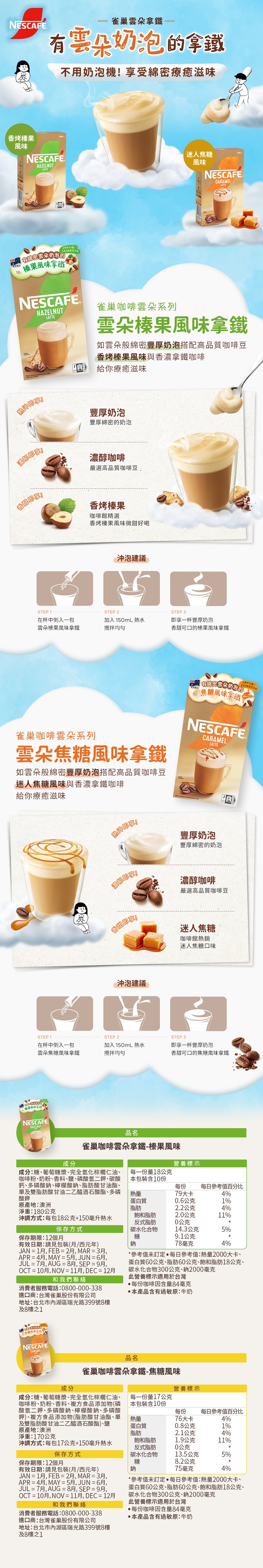 | 產品特色 | 有雲朵奶泡的榛果風味拿鐵 - 不用奶泡機,熱水沖即享豐厚綿密奶泡 - 快速享有咖啡館最受歡迎的榛果拿鐵 - 嚴選100%負責任採收**的高品質咖啡原豆 - 澳洲原裝進口香醇咖啡 **雀巢咖啡實行負責任耕種與採收計畫,請造訪Nescafe官網。 |