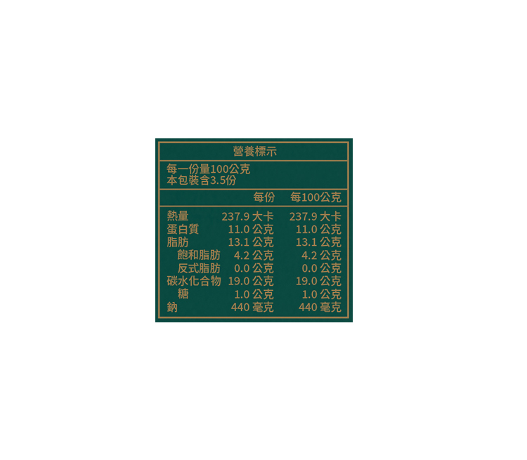 | 內容物(成分) | 雞肉、樹薯澱粉、玉米粉(非基因改造)、麵粉、棕櫚油、玉米澱粉、麵包粉【麵粉〔小麥麵粉、抗氧化劑(L-抗壞血酸)、澱粉水解酵素(樹薯澱粉、澱粉水解酵素、糊精、麵粉)、聚木糖酵素(樹薯澱粉、麵粉、聚木糖酵素)、磷脂酵素(樹薯澱粉、麵粉、磷脂酵素)〕、鹽、糖、酵母】、小麥蛋白、鹽、粘稠劑(磷酸二澱粉、醋酸澱粉、玉米糖膠)、品質改良劑(多磷酸鈉、酸性焦磷酸鈉、乳酸鈣、二氧化矽)、膨脹劑(碳酸氫鈉)、糖、大豆油、香料(紅椒油樹脂、薑黃萃取物、葵花油、丙二醇、聚山梨醇酐脂肪酸酯八十、香料)、調味劑(L-麩酸鈉、檸檬酸鈉)、蛋白粉、青花椒(青麻椒、澱粉)、辣椒、八角、青花椒香料【中鏈三酸甘油酯、香料、抗氧化劑(混合濃縮生育醇)】、荳蔻、辣椒抽出物(辣椒、辣椒油樹脂、脂肪酸聚合甘油酯、脂肪酸甘油酯、 大豆油、葵花油) |