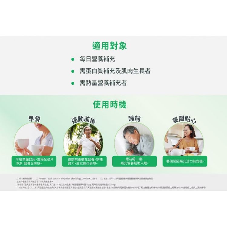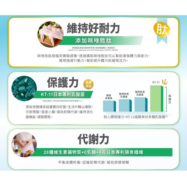 | 產品特色 | "◎13.8g優質蛋白 增肌給力 ◎專利乳酸菌KT-11調整體質 ◎維生素D/高鈣 維持骨骼健康 ◎咪唑胜肽 強健體能 ◎零乳糖" |