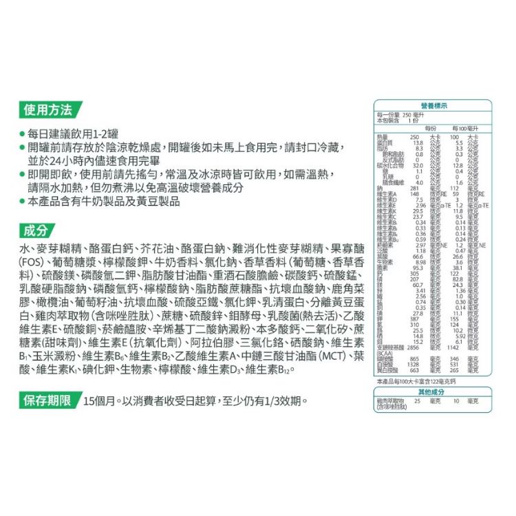 | 食用方式 | 即開即飲,使用前請先搖勻,常溫及冰涼時皆可飲用,如需溫熱,請隔水加熱,但勿煮沸以免高溫破壞營養成分 |