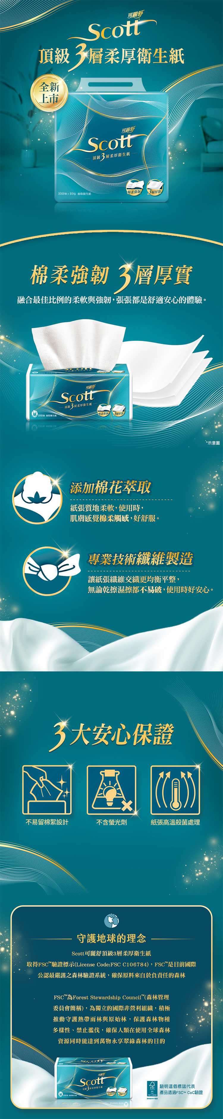 | 產品特色 | 财 3層厚實,柔韌兼具,融合最佳比例的柔軟與強韌 财 添加棉花萃取,肌膚感覺棉柔觸感,好舒服 财 專業技術纖維製造,讓紙張纖維交織更均衡平整,不易破 财 3大安心保證,不易留棉絮設計、不含螢光劑、紙張高溫殺菌處理 |