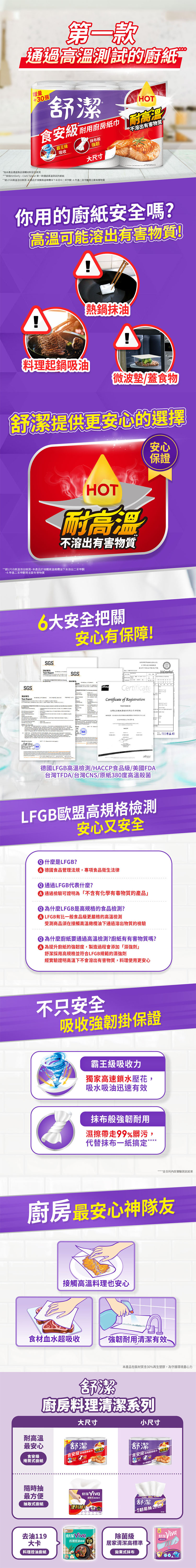 | 產品特色 | .舒潔廚房紙巾/廚紙 .第一款通過高溫測試的廚紙 .通過歐盟標準高溫檢測 真正最安心 .霸王級吸收力 .抹布般強韌耐用 |