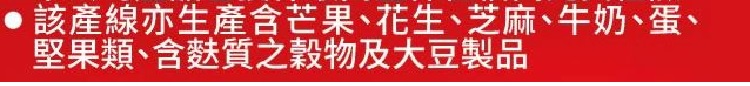 | 過敏源註記 | 該產線亦生產含芒果、花生、芝麻、牛奶、蛋、堅果類、含麩質之穀物及大豆製品 |
