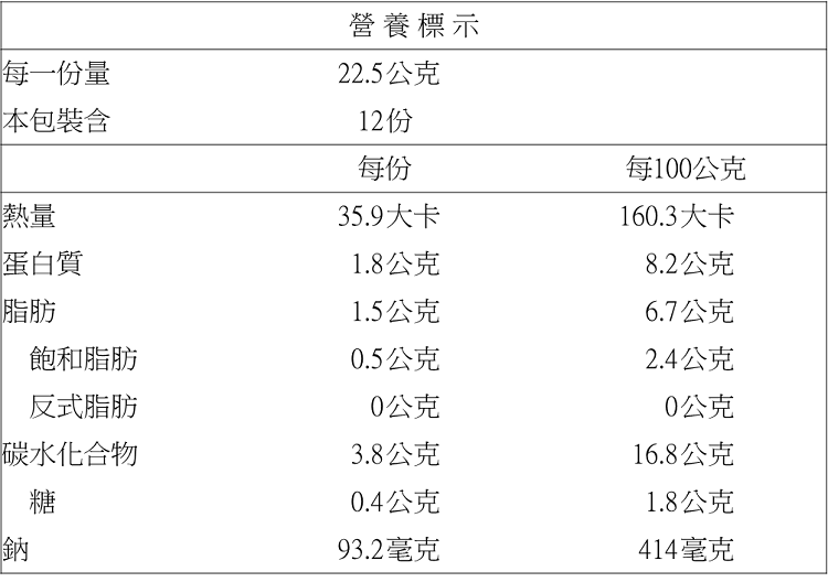 | 食品添加物名稱 | 焦糖色素、DL-蘋果酸.甜味劑-複方甘草萃.檸檬酸鈉.甘草萃.琥珀酸二鈉、羥丙基磷酸二澱粉、多磷酸鈉、5'-次黃嘌呤核甘酸二鈉、5'-鳥嘌呤核甘酸二鈉、二氧化矽、玉米糖膠。 |