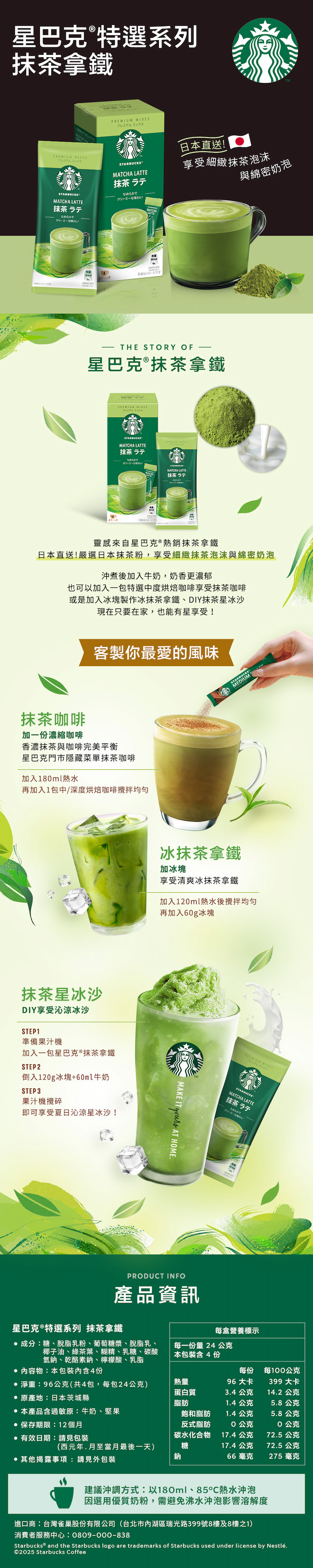 | 商品說明 | 1. 靈感來自星巴克門市的抹茶那堤 2. 選用日本直送優良抹茶粉,透過專業技術混和香純奶粉,為您呈現這杯帶有細緻抹茶泡沫與綿密奶泡的抹茶拿鐵,只需加入熱水,您就能隨時享受。 |
