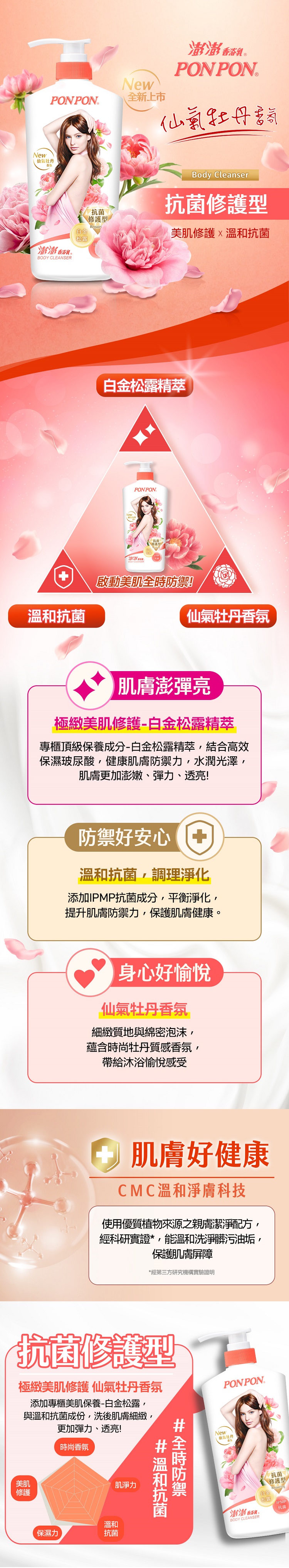 | 產品特色 | 1.肌膚澎彈亮!極緻美肌修護-白金松露精萃 專櫃頂級保養成分-白金松露精萃,結合高效保濕玻尿酸,健康肌膚防禦力,水潤光澤,肌膚更加澎嫩、彈力、透亮! 2.防禦好安心!溫和抗菌,調理淨化 添加IPMP抗菌成分,平衡淨化,提升肌膚防禦力,保護肌膚健康。 3.身心好愉悅!仙氣牡丹香氛 細緻質地與綿密泡沫,蘊含時尚牡丹質感香氛,帶給沐浴愉悅感受。 |