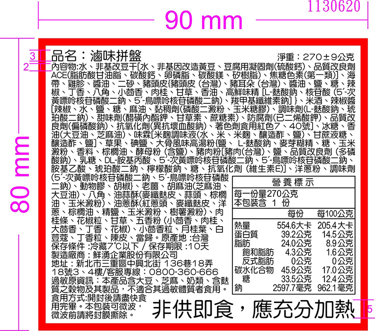 | 內容物(成分) | 非基改豆干[水、非基因改造黃豆、豆腐用凝固劑(硫酸鈣)、品質改良劑ACE(脂肪酸甘油脂、碳酸鈣、卵磷脂、碳酸鎂、矽樹脂)、焦糖色素(第一類)]、海帶、雞胗、醬油、二砂、豬頭皮{豬頭皮 (台灣)、豬耳朵 (台灣)、醬油、鹽、糖、辣椒、丁香、八角、小茴香、肉桂、甘草、香油、高鮮味精 [L-麩酸鈉、核苷酸 (5'-次黃嘌呤核苷磷酸二鈉、5'-鳥嘌呤核苷磷酸二鈉)、羧甲基纖維素鈉]}、米酒、辣椒醬[辣椒,水,鹽,糖,麻油,黏稠劑(磷酸二澱粉,玉米糖膠),調味劑(L-麩酸鈉,琥珀酸二鈉),甜味劑(醋磺內酯鉀,甘草素,蔗糖素),防腐劑(已二烯酸鉀),品質改良劑(偏磷酸鈉),抗氧化劑(異抗壞血酸鈉),著色劑食用紅色7.40號]、冰糖、香油(大豆油、芝麻油)、味霖[米麴調味液(水,米,米麴,釀造酢,鹽),甘蔗液糖,釀造酢,鹽]、草果、碘鹽、大骨風味高湯粉〔鹽, L-麩酸鈉, 麥芽糊精, 糖, 玉米澱粉, 香料, 棕櫚油, 酵母粉 (含鹽), 豬肉粉 [豬肉(台灣), 鹽, 品質改良劑 (多磷酸鈉), 乳糖, DL-胺基丙酸, 5'-次黃嘌呤核苷磷酸二鈉, 5'-鳥嘌呤核苷磷酸二鈉, 胺基乙酸, 琥珀酸二鈉, 檸檬酸鈉, 糖, 抗氧化劑 (維生素E)],洋蔥粉, 調味劑 (5'-次黃嘌呤核苷磷酸二鈉, 5'-鳥嘌呤核苷磷酸二鈉), 動物膠, 胡椒〕、老薑、胡麻油(芝麻油、大豆油)、八角、油蒜酥(麥纖麩皮,蒜頭,棕櫚油,玉米澱粉)、油蔥酥(紅蔥頭、麥纖麩皮、洋蔥、棕櫚油、精鹽、玉米澱粉、樹薯澱粉)、肉桂條、花椒粒、甘草、五香粉(小茴香、肉桂、大茴香、丁香、花椒)、小茴香粒、白荳蔻、丁香粒、陳皮、當歸、月桂葉 |