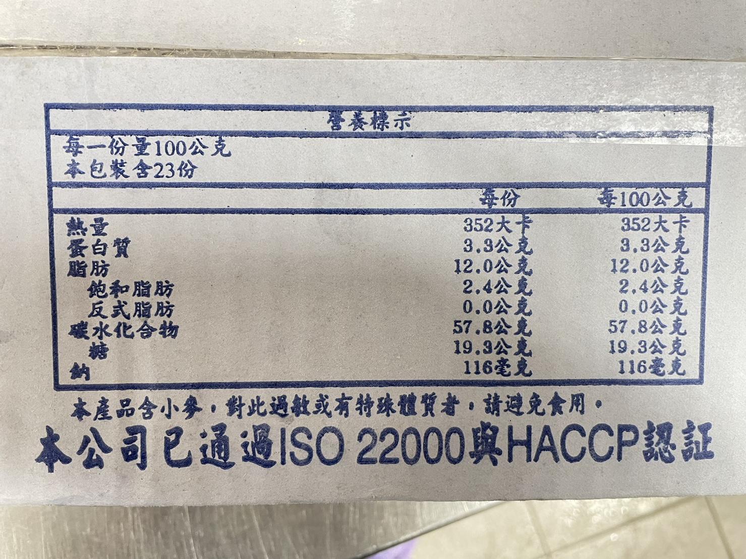 | 內容物(成分) | 芋頭、馬鈴薯粉、砂糖、麵粉、小麥粉、芋頭香精、棕櫚油、鹽、香草粉、餅乾【麵粉(小麥粉)、砂糖、椰子油、精鹽、膨脹劑(碳酸氫銨、碳酸氫鈉)】 |