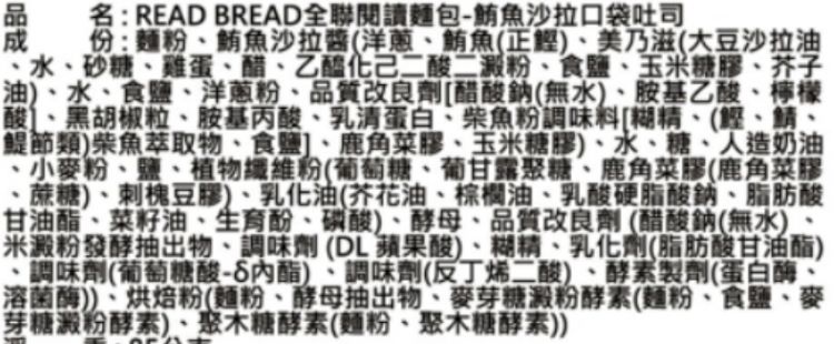 | 內容物(成分) | 麵粉、鮪魚沙拉醬(洋蔥、鮪魚(正鰹)、美乃滋(大豆沙拉油、水、砂糖、雞蛋、醋、乙醯化己二酸二澱粉、食鹽、玉米糖膠、芥子油)、水、食鹽、洋蔥粉、品質改良劑[醋酸鈉(無水)、胺基乙酸、檸檬酸]、黑胡椒粒、胺基丙酸、乳清蛋白、柴魚粉調味料[糊精、(鰹、鯖、鯷節類)柴魚萃取物、食鹽]、鹿角菜膠、玉米糖膠)、水、糖、人造奶油、小麥粉、鹽、植物纖維粉(葡萄糖、葡甘露聚糖、鹿角菜膠(鹿角菜膠、蔗糖)、刺槐豆膠)、乳化油(芥花油、棕櫚油、乳酸硬脂酸鈉、脂肪酸甘油酯、菜籽油、生育酚、磷酸)、酵母、品質改良劑 (醋酸鈉(無水) 、米澱粉發酵抽出物、調味劑 (DL 蘋果酸)、糊精、乳化劑(脂肪酸甘油酯)、調味劑(葡萄糖酸-δ內酯) 、調味劑(反丁烯二酸) 、酵素製劑(蛋白酶、溶菌酶))、烘焙粉(麵粉、酵母抽出物、麥芽糖澱粉酵素(麵粉、食鹽、麥芽糖澱粉酵素)、聚木糖酵素(麵粉、聚木糖酵素)) |