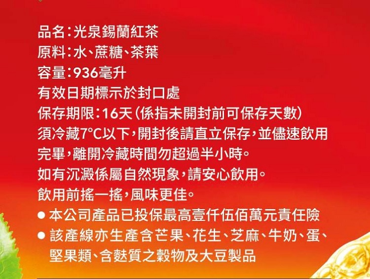 | 製造廠商 | 光泉食品股份有限公司 (02)8751-8788 台北市內湖區瑞光路502號4樓 星期一至星期五0930~1730 |