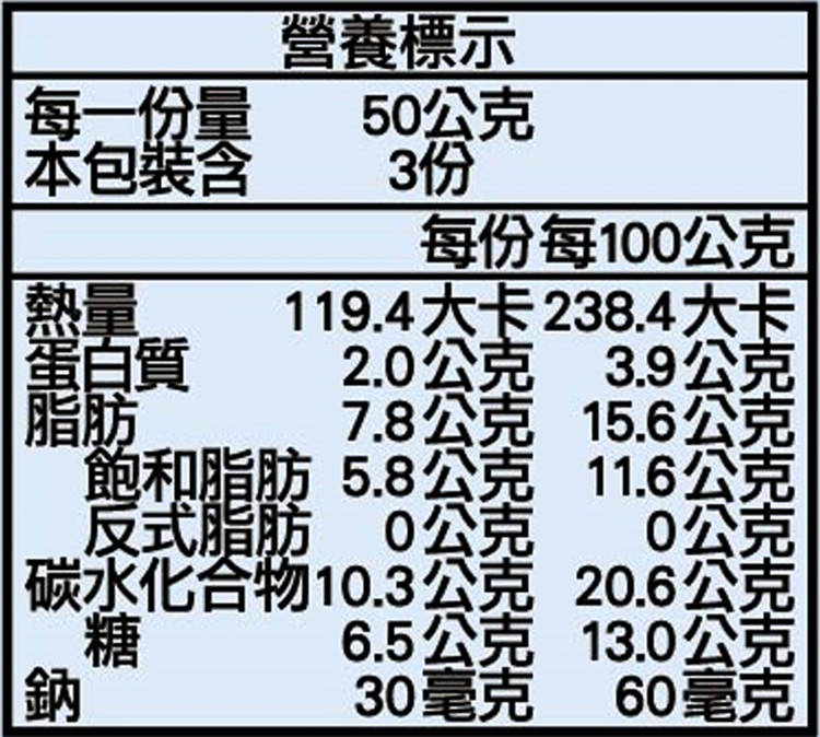 | 過敏源註記 | 本產品內含麩質之穀物、蛋類、奶類、大豆、魚類及其製品之過敏原 |