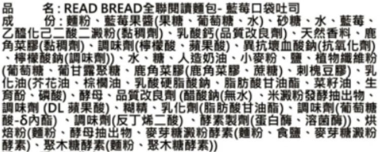 | 內容物(成分) | 麵粉、藍莓果醬(果糖、葡萄糖、水)、砂糖、水、藍莓、乙醯化己二酸二澱粉(黏稠劑)、乳酸鈣(品質改良劑)、天然香料、鹿角菜膠(黏稠劑)、調味劑(檸檬酸、蘋果酸)、異抗壞血酸鈉(抗氧化劑)、檸檬酸鈉(調味劑))、水、糖、人造奶油、小麥粉、鹽、植物纖維粉(葡萄糖、葡甘露聚糖、鹿角菜膠(鹿角菜膠、蔗糖)、刺槐豆膠)、乳化油(芥花油、棕櫚油、乳酸硬脂酸鈉、脂肪酸甘油酯、菜籽油、生育酚、磷酸)、酵母、品質改良劑 (醋酸鈉(無水) 、米澱粉發酵抽出物、調味劑 (DL 蘋果酸)、糊精、乳化劑(脂肪酸甘油酯)、調味劑(葡萄糖酸-δ內酯) 、調味劑(反丁烯二酸) 、酵素製劑(蛋白酶、溶菌酶))、烘焙粉(麵粉、酵母抽出物、麥芽糖澱粉酵素(麵粉、食鹽、麥芽糖澱粉酵素)、聚木糖酵素(麵粉、聚木糖酵素)) |